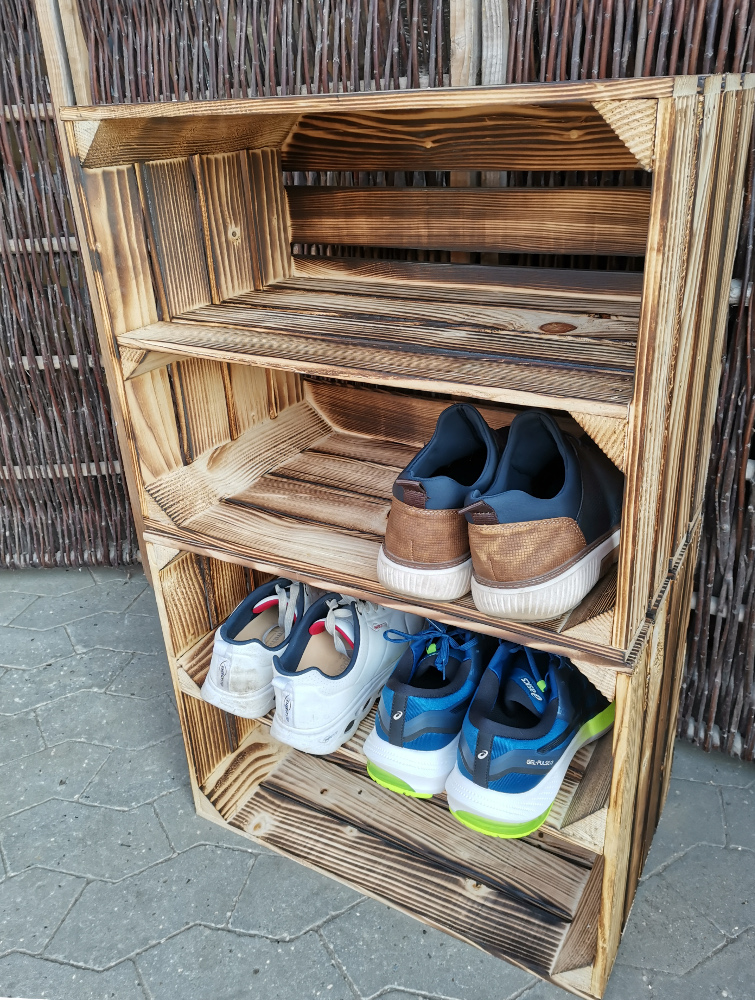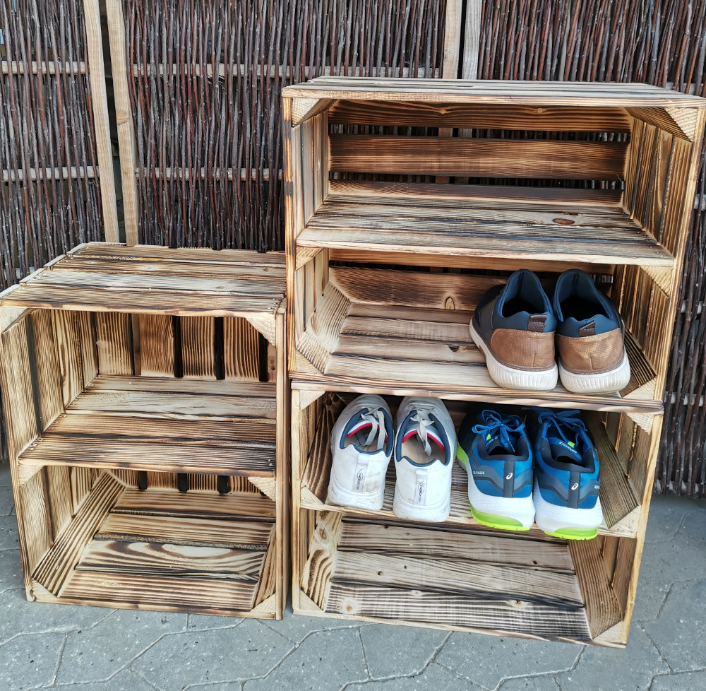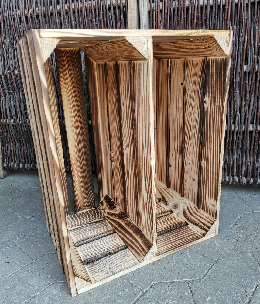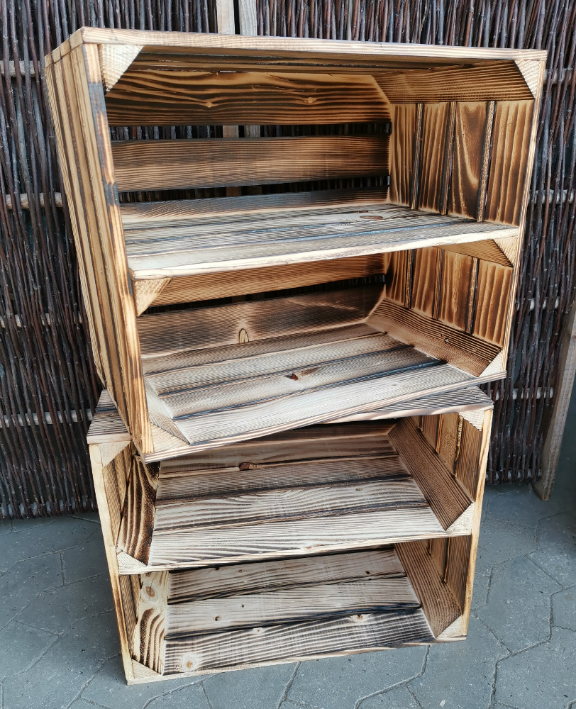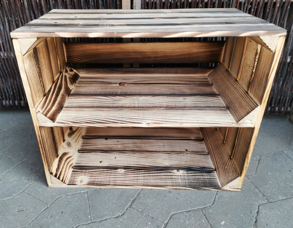 Nyproducerede æblekasser i træ som er blevet flammet og der er monteret en hylde på den længste led - altså på langs af kassen. Hylden er placeret cirka i midten af kassen.
