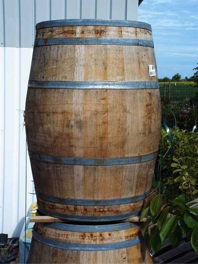 Står som hel tønde hvor vinen blot er tappet af. Smuk original rustik brugt spansk/fransk vintønde i egetræ.