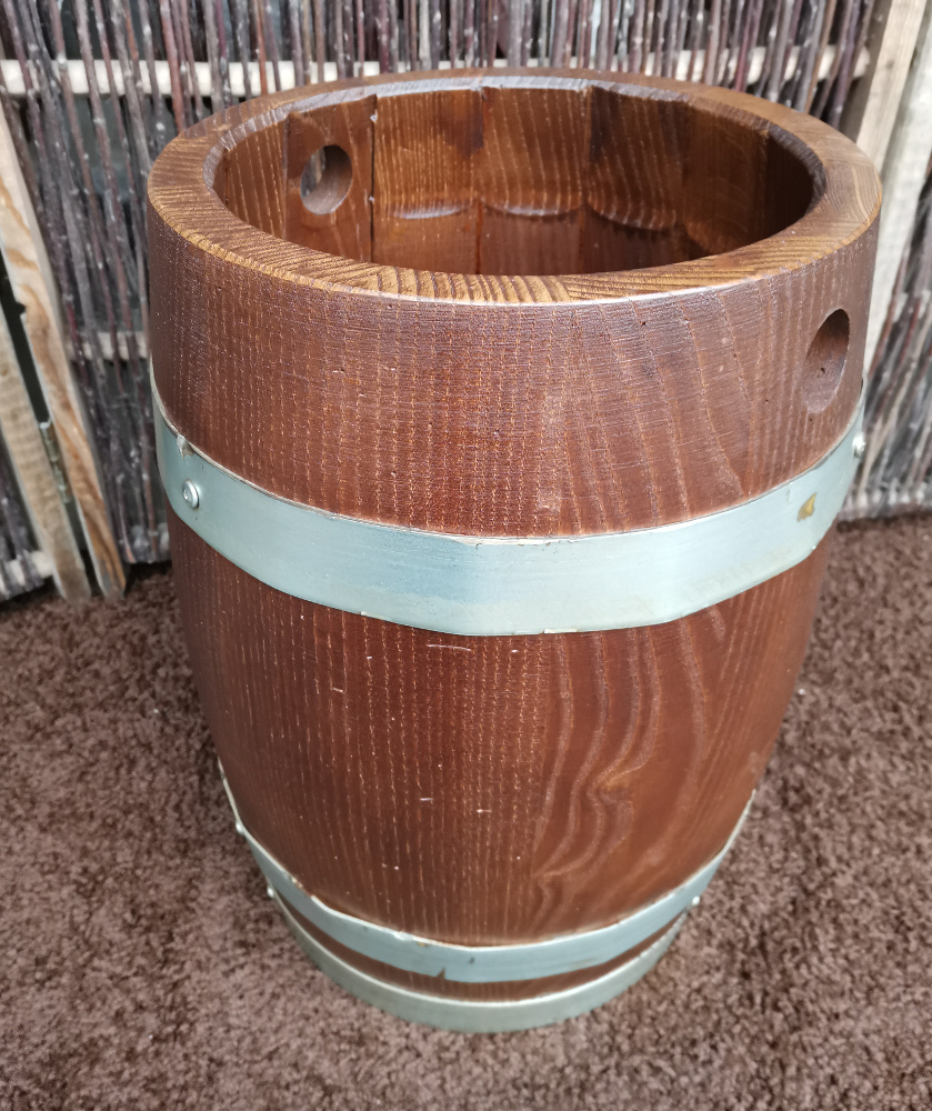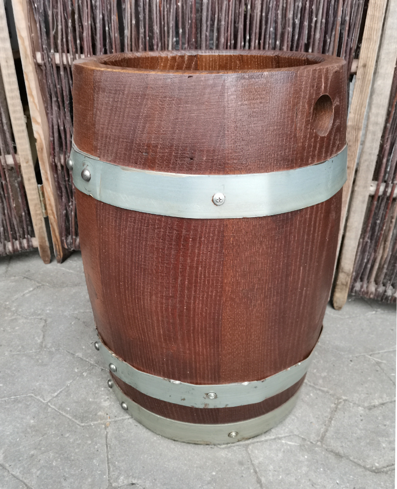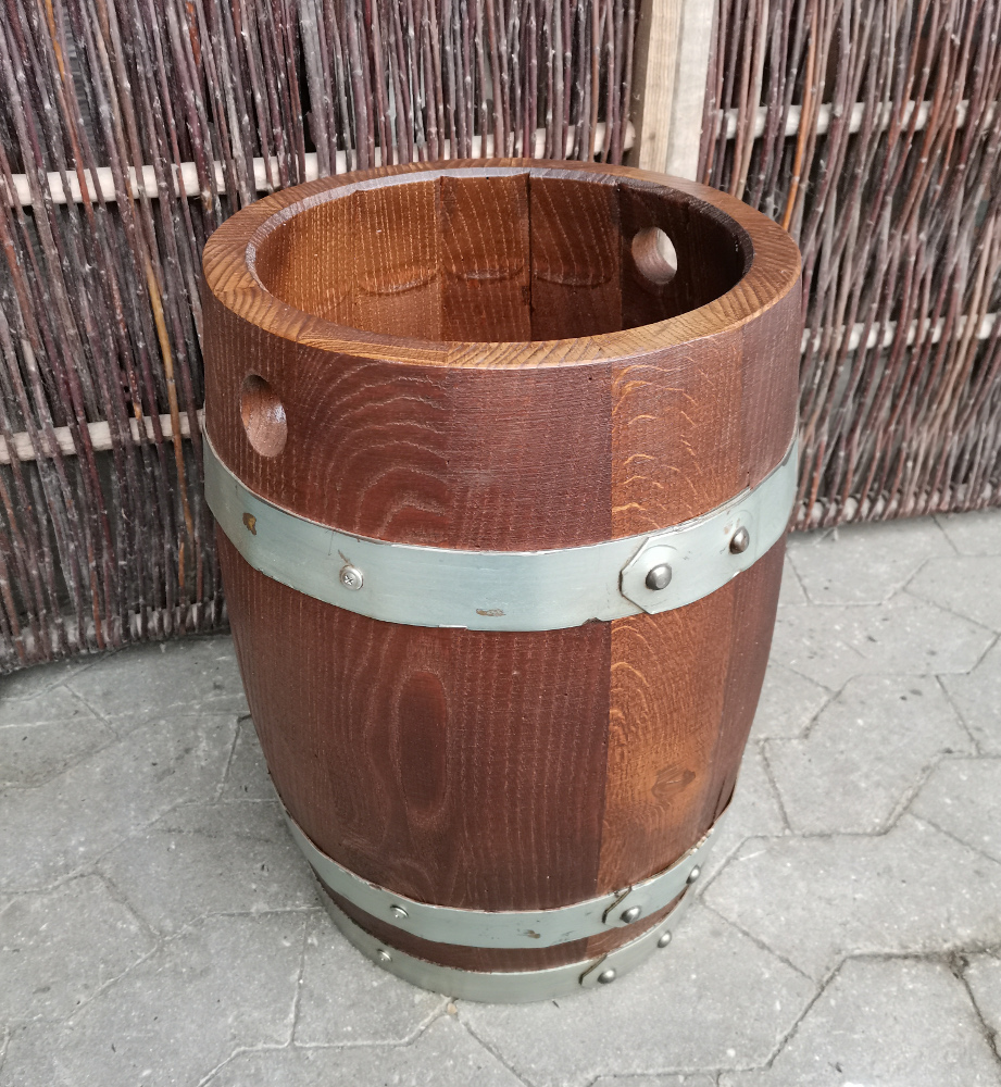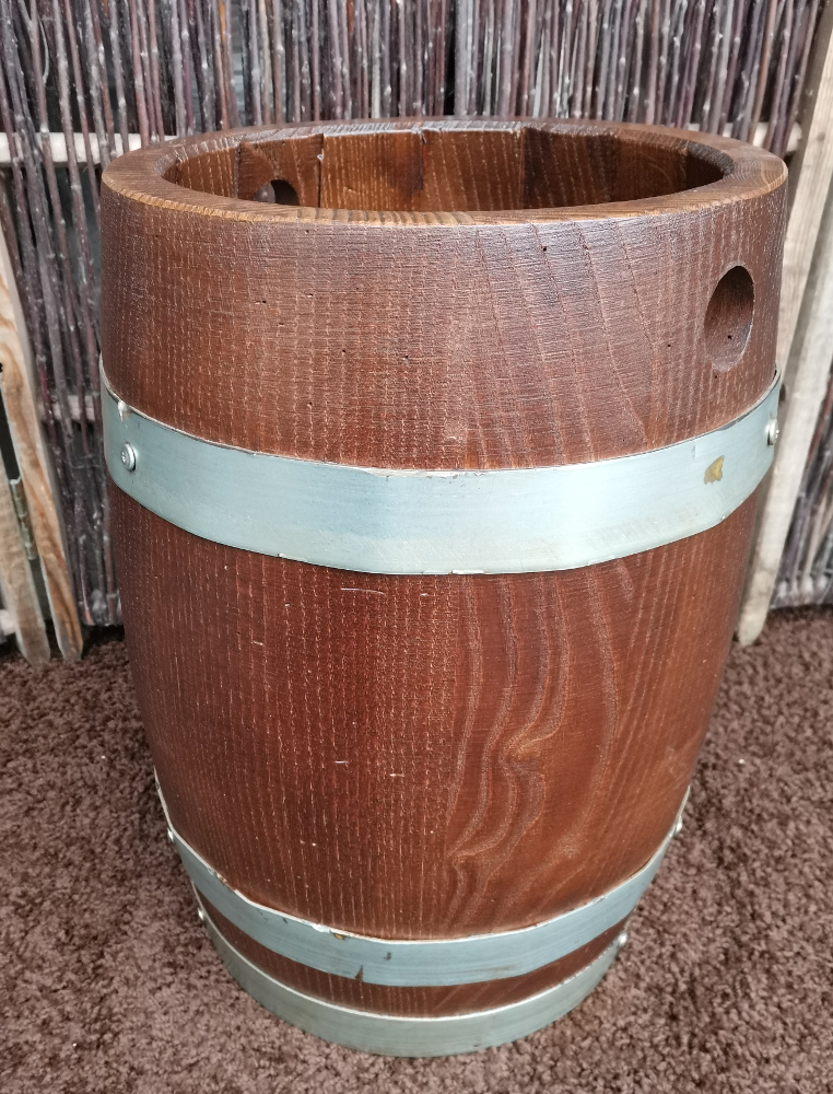 Nyproduceret lille åben tønde fra Italien med Galvaniserede ringe og udført i brunbejdset og lakeret bøgetræ. En del af deLuxe-serien.