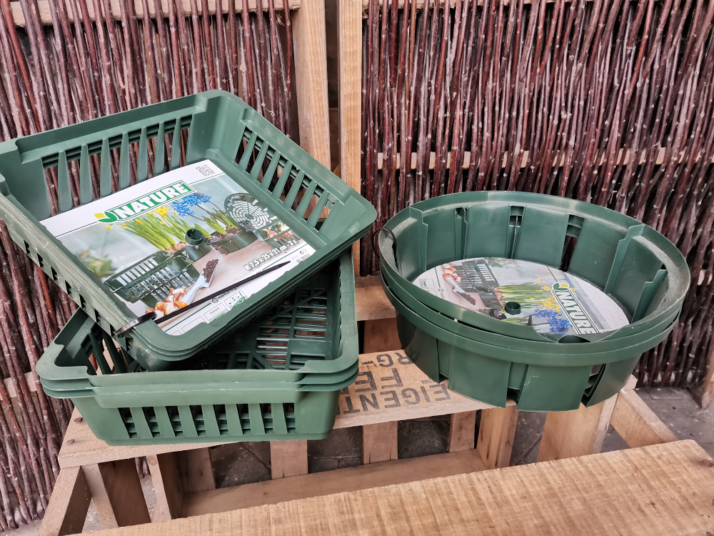 Der er mange fordele ved at lægge sine løg i kurve. Hvis man har en meget tung jord, kan det være en fordel at lave en lettere jordblanding og bruge den i kurvene inden man graver dem ned. Plantebakkerne er også nemme at grave op og de er stabelbare, så man kan flytte rundt på sine løg fx fra krukker, bede eller kirkegården og stille dem væk.