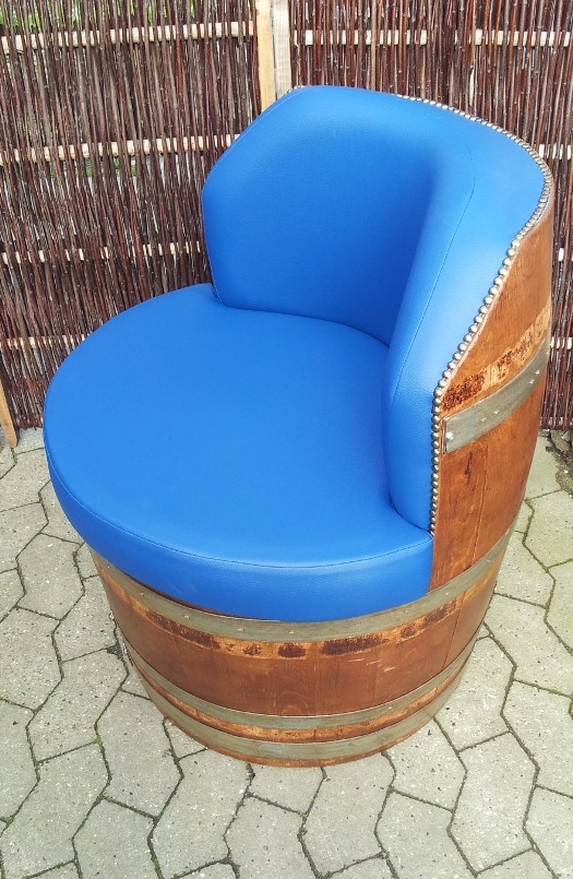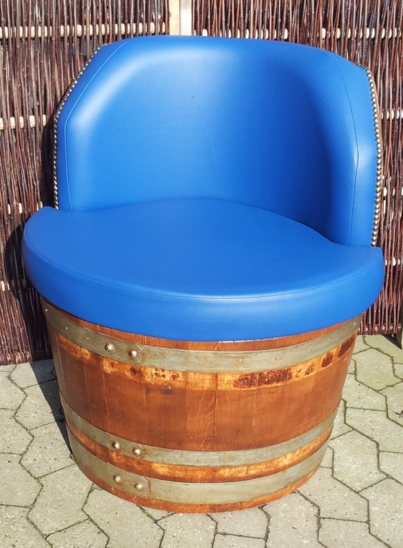 Virkelig lækker vintøndestol med polstring i blå farve. Tøndestolen er skåret af en original brugt vintønde. Den er tørret, bejdset og lakeret og polstret. Sædet kan løftes op og der er plads til opbevaring nedenunder sædet i stoles "fod"..