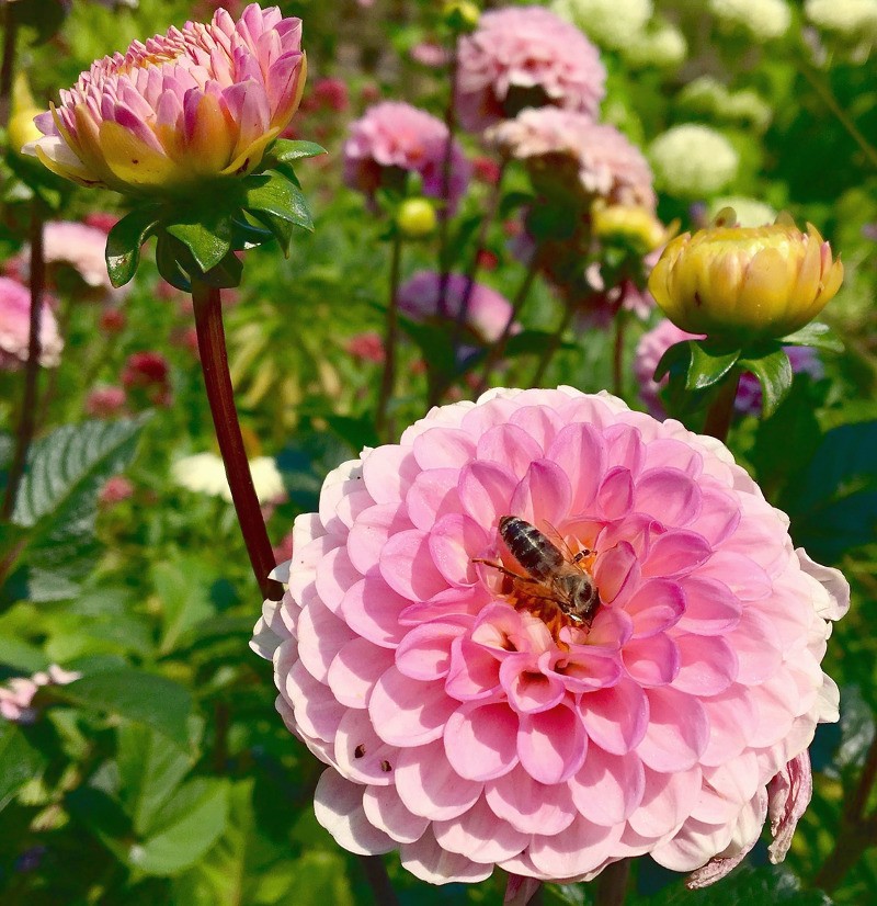Går fra ret lyserøde nuancer mod de mere rosa og er primært fyldt men til glæde for bierne heldigvis, blotter en del blomster ind imellem også deres midte.