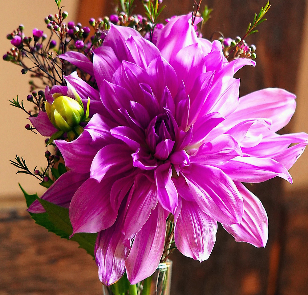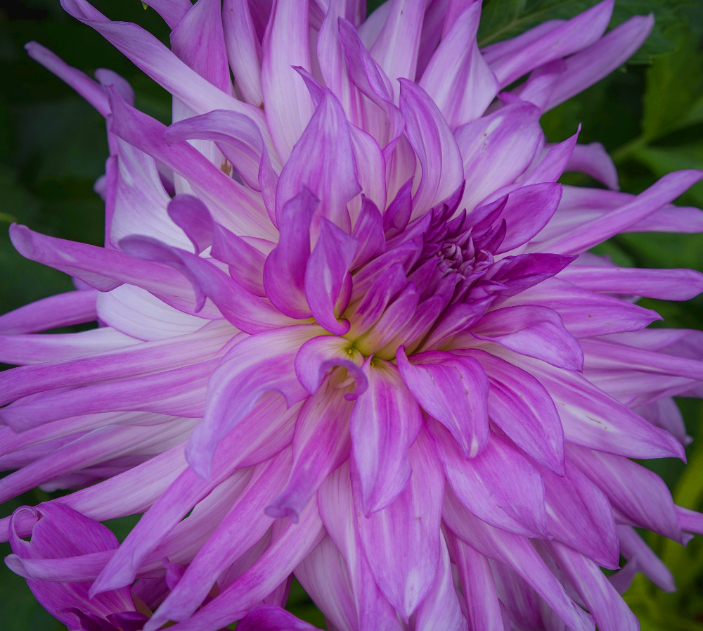 En lilla Dahlia som mod midten gerne har en hvid bund der hos nogen blomster trækkes ud i kronbladene. Den kan være ret farverig lilla måske med strejf af en lavendelpink tone i starten og senere lysne noget mod en lys lilla med mere eller mindre hvidt.