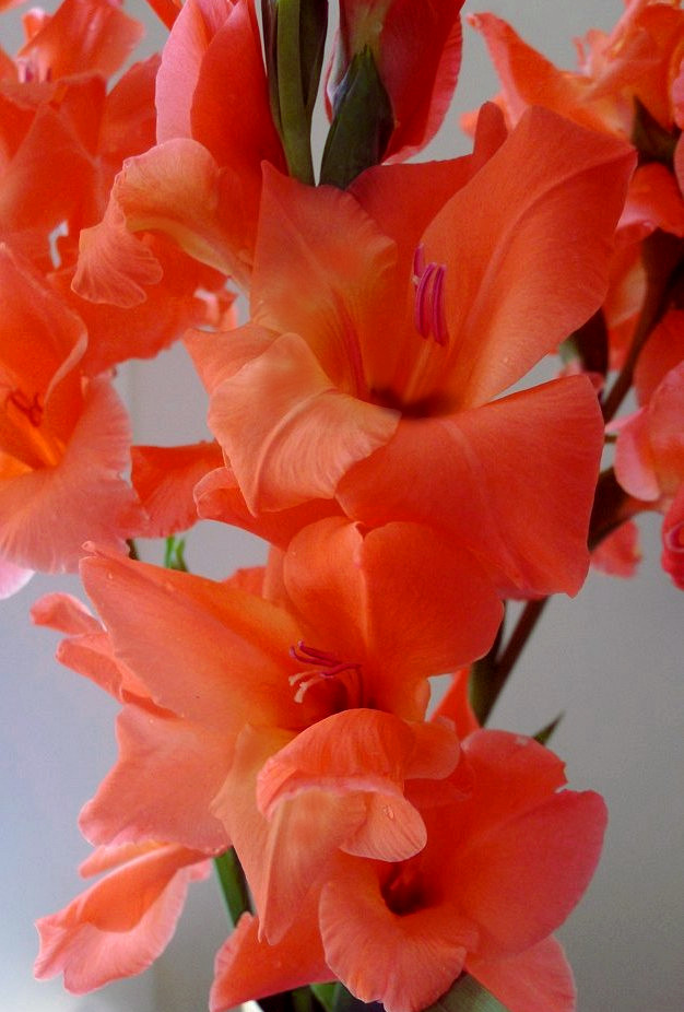 Glamini Jenny, kompakt Gladiolus. Næsten signalrøde knopper der funkler i bedet når Jenny står med store knopper. Når hun springer ud er det med intens orange farve på blomsterne.