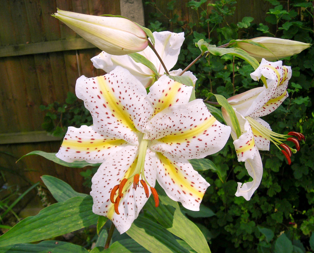 Meget store hvide blomster med gult bånd og fine fregner.