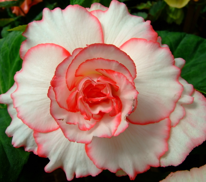 Storblomstret Picotee Begonie med smukke dobbelte blomster i Hvid med først en tynd kant i pink til rødlig og senere i blomstringen trækker de røde og pink nuancer ud i det hvide og kommer til at fylde mere.
