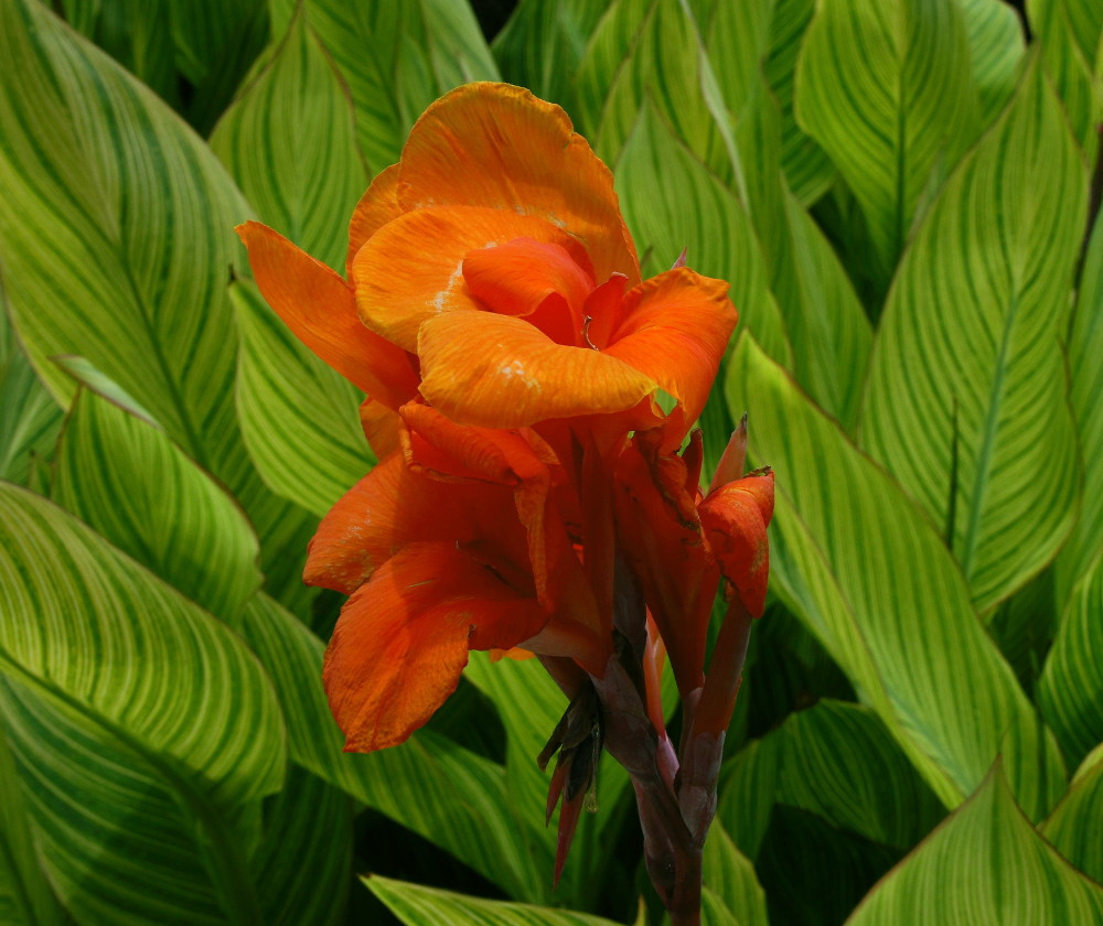 Canna med Orange blomster og de mest fantasiske grønne og gulstribede blade. En stor Canna der vækker opmærksomhed.