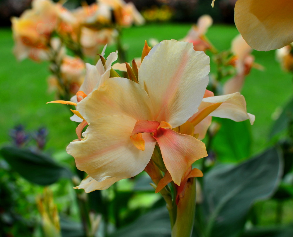 En canna der er god til at skabe et tropisk look på terrassen med sine varmt gule til pastelorange og laks blomster generelt i abrikos toner mod de mørkegrønne blade som har anstrøg af de brunlige nuancer ligesom stilkene har.