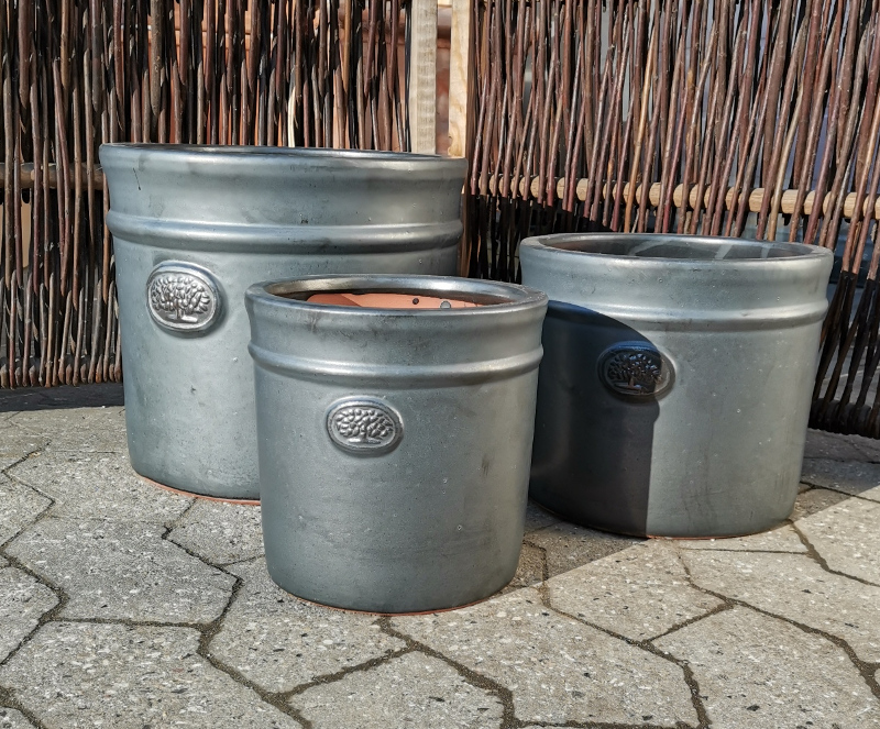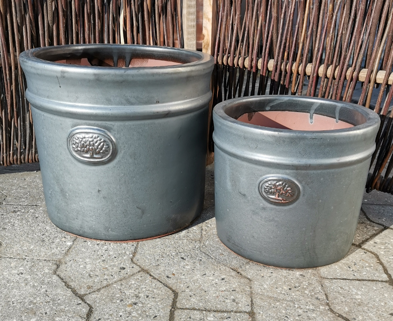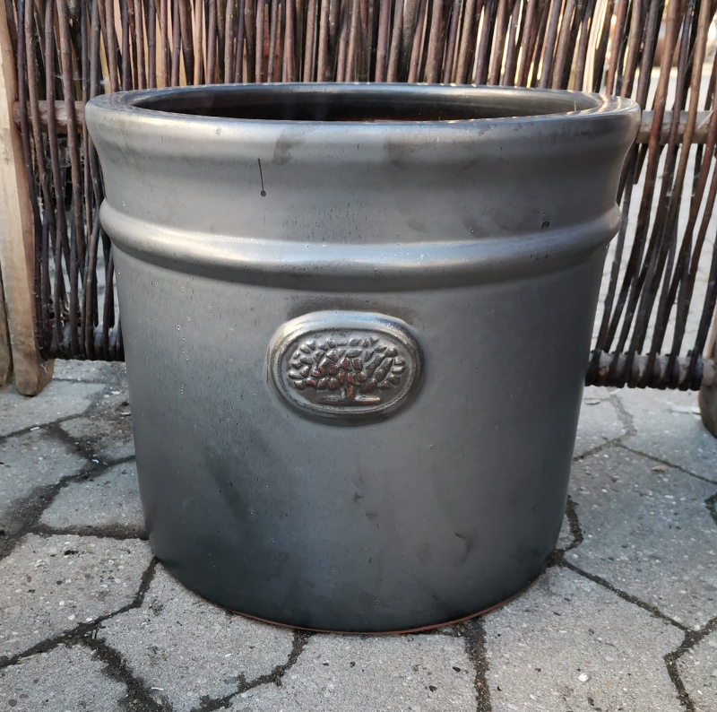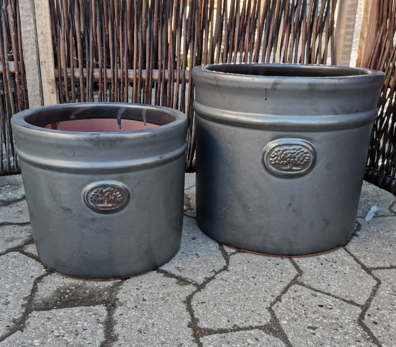 Runde elegante krukker i den klassiske mat sorte farve som hos mange nok vil give mere mening hvis den hed grafit eller koksgrå eller noget tilsvarende. Udsmykket med et lille træ på forsiden og en fremhævet ring over.