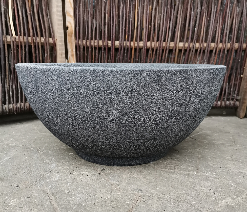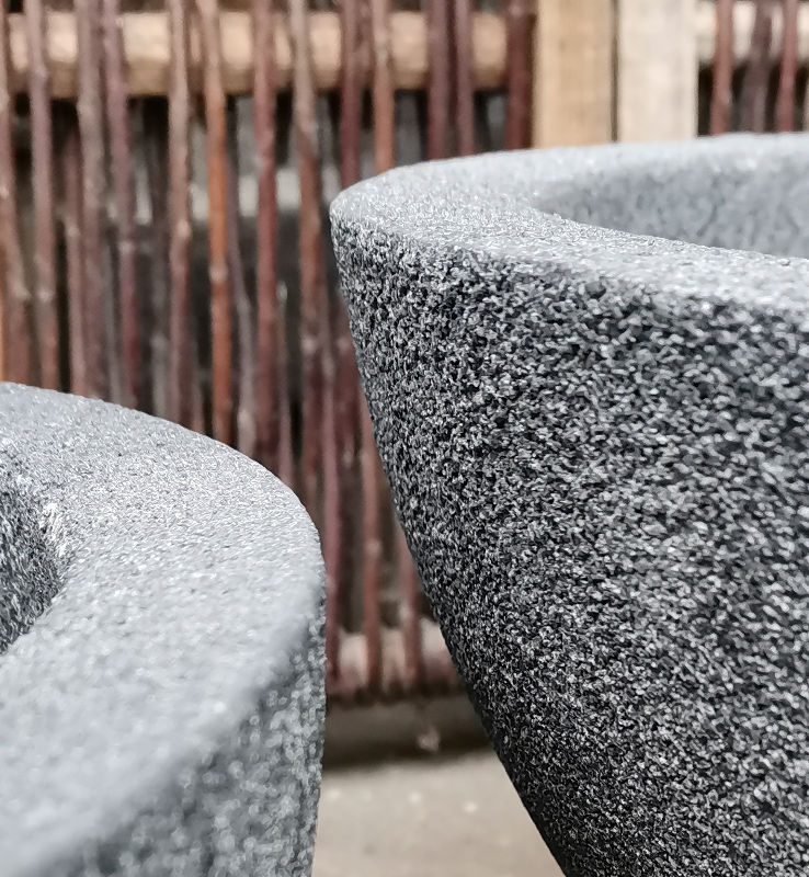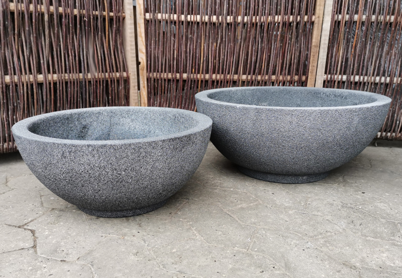 Fra den serie af krukker som producenten kalder for "Light Granite Stone" er her de lave runde mørkegrå Kunststofkrukker med stenoverflade. Plantefade i nærmest naturtro sten-look.