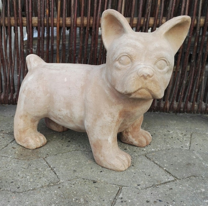 Søde hundefigurer af racen Fransk Bulldog udført i chokofarvet terracotta.