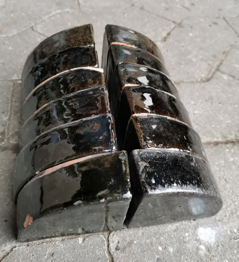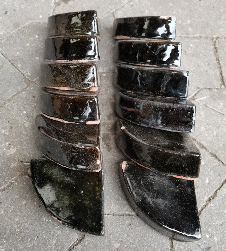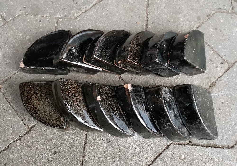 Glaserede keramik krukkefødder i en blank sort glasering som kan variere i nuancerne ligesom der ofte er pletter af andre farver i det sorte. Der er i disse partier ret stor variation på farverne også inden for hvert parti.