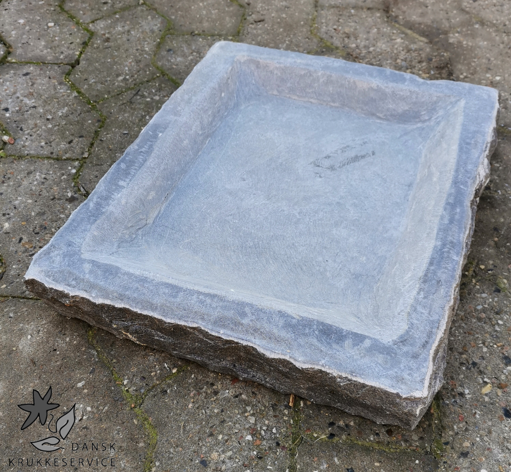 Meget mørkegråt fuglebad hugget i en stentype der kaldes basalt. Omtales også tit som sort granit, men helt korrekt er der ikke tale om granit i klassisk forstand. Basalt har et mere "bjergagtigt" udtryk og lag og årer ses ofte lidt tydeligere end i en finkornet granit.