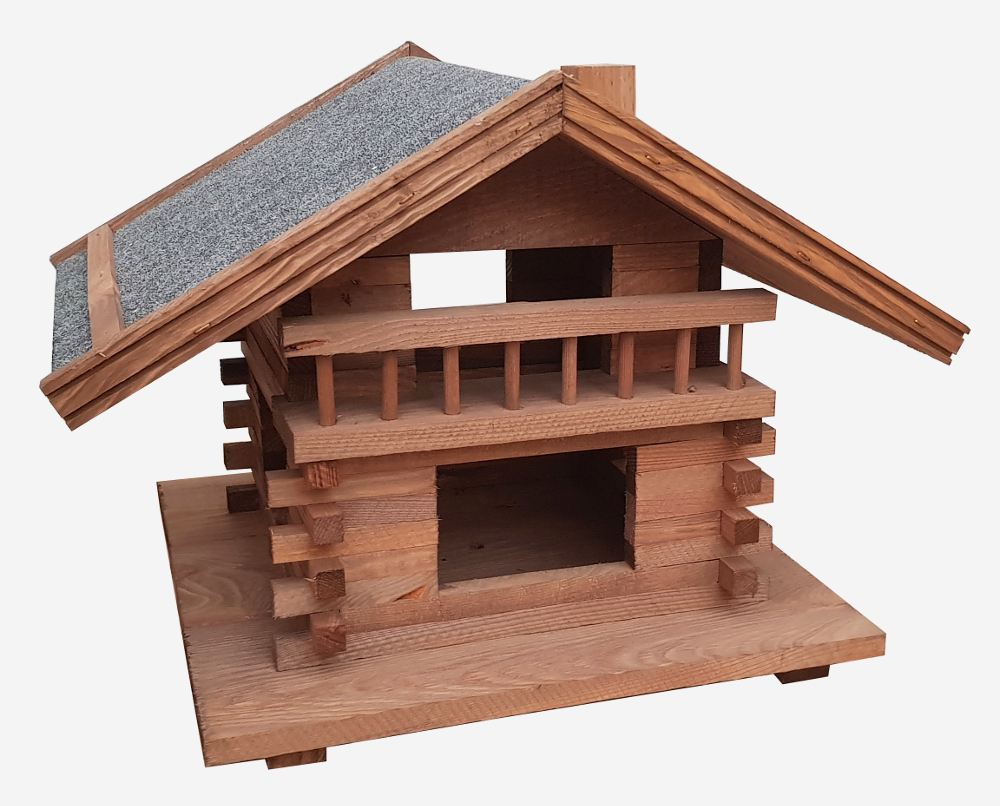 Stort flot fuglefoderhus i to etager og med tag med tagpap.